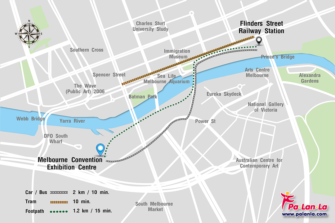 - การเดิน (Footpath) การเดินจากสถานี Flinders Street Station ผ่าน Flinders St/State Route 30 และ Yarra Promenade ไปยัง Melbourne Convention Exhibition Centre มีระยะทาง 1.2 กิโลเมตร ใช้เวลา 15 นาที