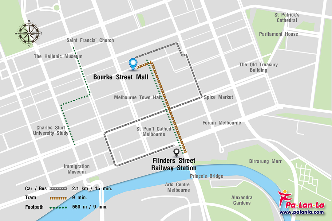 - การเดิน (Footpath) การเดินจากสถานี Flinders Street Station ผ่าน Swanston St ไปยัง Bourke Street Mall มีระยะทางเพียง 550 เมตร ใช้เวลาประมาณ 9 นาที เป็นวิธีที่สะดวกและได้รับความนิยม
