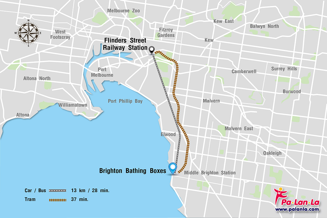 - รถยนต์ (Car) การเดินทางโดยรถยนต์จากเมลเบิร์น ไป Brighton Bathing Boxes โดยผ่าน State Route 33 มีระยะทาง 14 กิโลเมตร ใช้เวลาเดินทางประมาณ 30 นาที