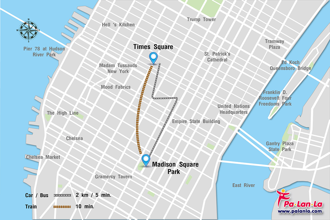 - รถยนต์ (Car) จาก Times Square ไปยัง Madison Square Park ใช้เวลาประมาณ 5 นาที ทั้งนี้ขึ้นอยู่กับสภาพการจราจร