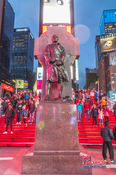 อนุสาวรีย์คุณพ่อฟรานซิส พี. ดัฟฟี่ อยู่ด้านหน้าอัฒจันทร์แก้วสีแดง และอนุสาวรีย์ของจอร์จ ไมเคิล โคแฮน นักเขียนเพลงและบทละครบรอดเวย์ชาวอเมริกัน