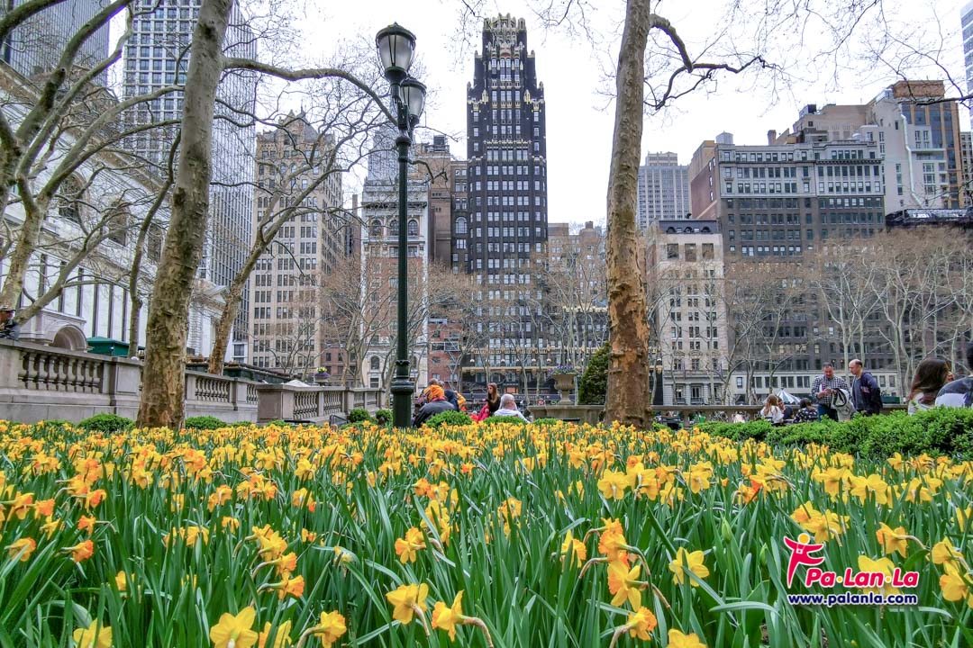 สวนสาธารณะไบรอันท์พาร์ก (Bryant Park) สวนสาธารณะกลางเมืองนิวยอร์ก เสมือนเมืองล้อมป่าที่มีฉากหลังเป็นหอสมุดประชาชนนิวยอร์ก (New York Public Library) เมื่อถึงฤดูใบไม้ผลิจะมีการจัดสวนด้วยดอกแดฟโฟดิลอันเป็นสัญลักษณ์ของความเข้มแข็ง อดทน และการเริ่มต้นสิ่งใหม่ๆ นอกจากนี้ภายในสวนยังมีกิจกรรมที่ปรับเปลี่ยนไปตามฤดูกาล และจุดเด่นของสวนสาธารณะแห่งนี้คือม้าหมุนคลาสสิกสไตล์ฝรั่งเศส (Le Carrousel) ที่เป็นรูปสัตว์ถึง 14 ชนิดให้บริการ