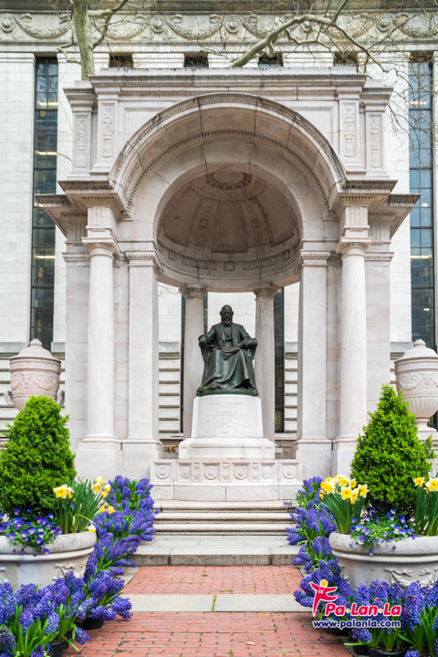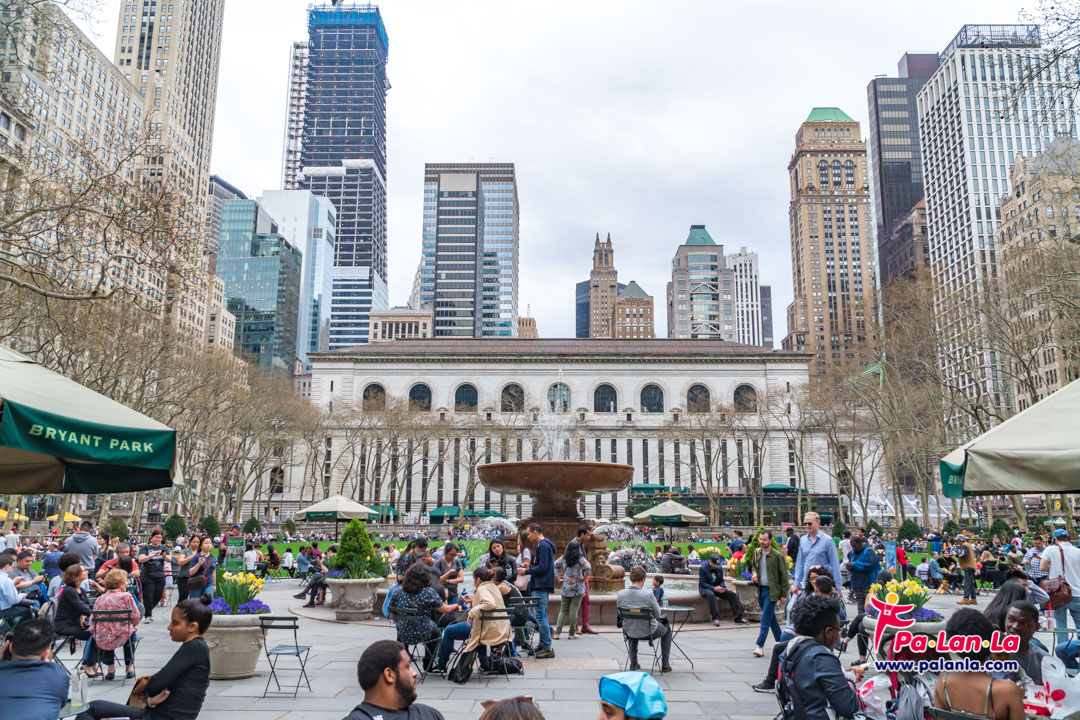 สวนสาธารณะไบรอันท์พาร์กที่มีฉากหลังเป็นหอสมุดประชาชนนิวยอร์ก
