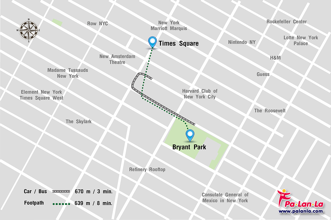- รถยนต์ (Car / Bus) จาก Times Square ไปยัง Bryant Park ระยะทางประมาณ 670 เมตร ใช้เวลาประมาณ 3 นาที