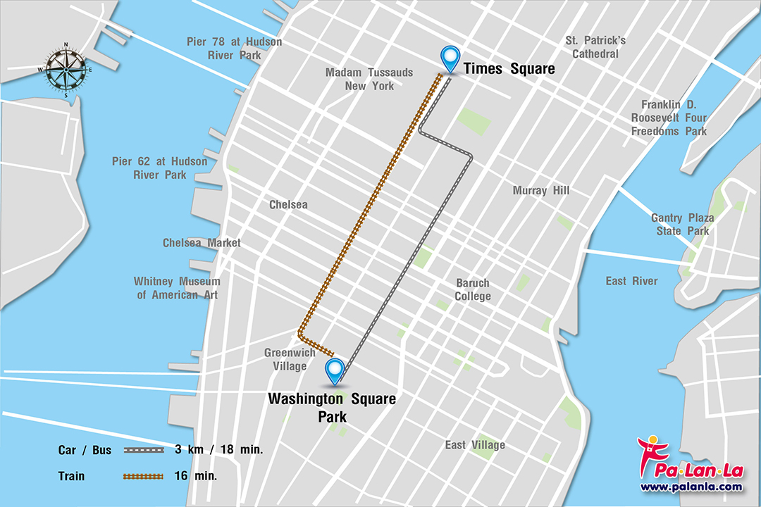 - รถยนต์ (Car) จาก Times Square ไปยัง Washington Square Park ระยะทางประมาณ 3 กิโลเมตร ใช้เวลาประมาณ 18 นาที ทั้งนี้ขึ้นอยู่กับสภาพการจราจร