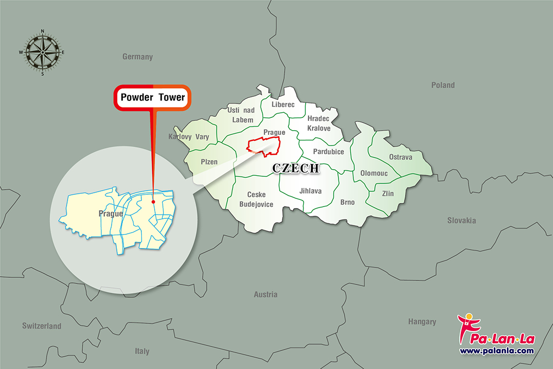 ซุ้มประตูเมือง (Powder Tower) สัญลักษณ์สำคัญที่ถูกสร้างขึ้นมาในปี ค.ศ. 1475 ยุคที่เมืองปราก เป็นศูนย์กลางการปกครองของทวีปยุโรป โดยผู้มีอิทธิพลในเวลานั้น ต้องการสร้างซุ้มประตูเมือง เพื่อใช้เป็นหมุด ที่บ่งบอกถึงเขตแดนของเมือง จึงเกิดเป็นซุ้มประตูเมือง 13 แห่ง ที่กระจายอยู่ทั่วย่านเมืองเก่ารวมถึงซุ้มประตูเมือง (Powder Tower) แห่งนี้ และด้วยที่ตั้ง ซึ่งถือเป็นจุดเริ่มต้นสำคัญ ในการเข้าไปสู่ใจกลางประวัติศาสตร์อันยิ่งใหญ่ของเมืองปราก ทำให้ซุ้มประตูแห่งนี้มีความน่าสนใจ และควรค่าแก่การมาเยี่ยมชม โดยซุ้มประตูเมือง (Powder Tower) ถูกออกแบบในสไตล์โกธิค (Gothic) ทั่วทั้งหอคอย ส่วนโครงสร้างด้านนอกนั่น เต็มไปด้วยตราสัญลักษณ์ และประติมากรรมที่แสดงถึงความยิ่งใหญ่ของปราก นอกจากนั้นที่นี่ยังเป็นเส้นทางเริ่มต้นของพิธีการสำคัญๆ ที่เป็นตำนานของเมืองหลายพิธี