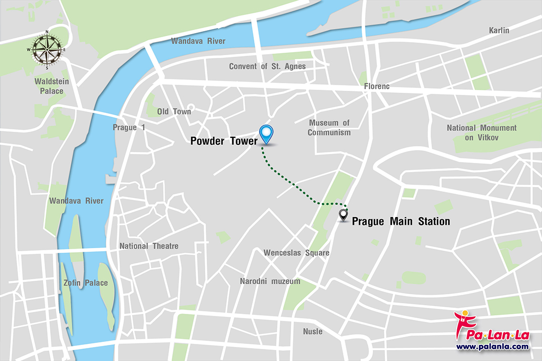 - เดิน จาก Prague Main Station สามารถเดินไปยัง ซุ้มประตูเมืองได้เลย ระยะทางประมาณ 750 เมตร ใช้เวลาเดินประมาณ 12 นาที