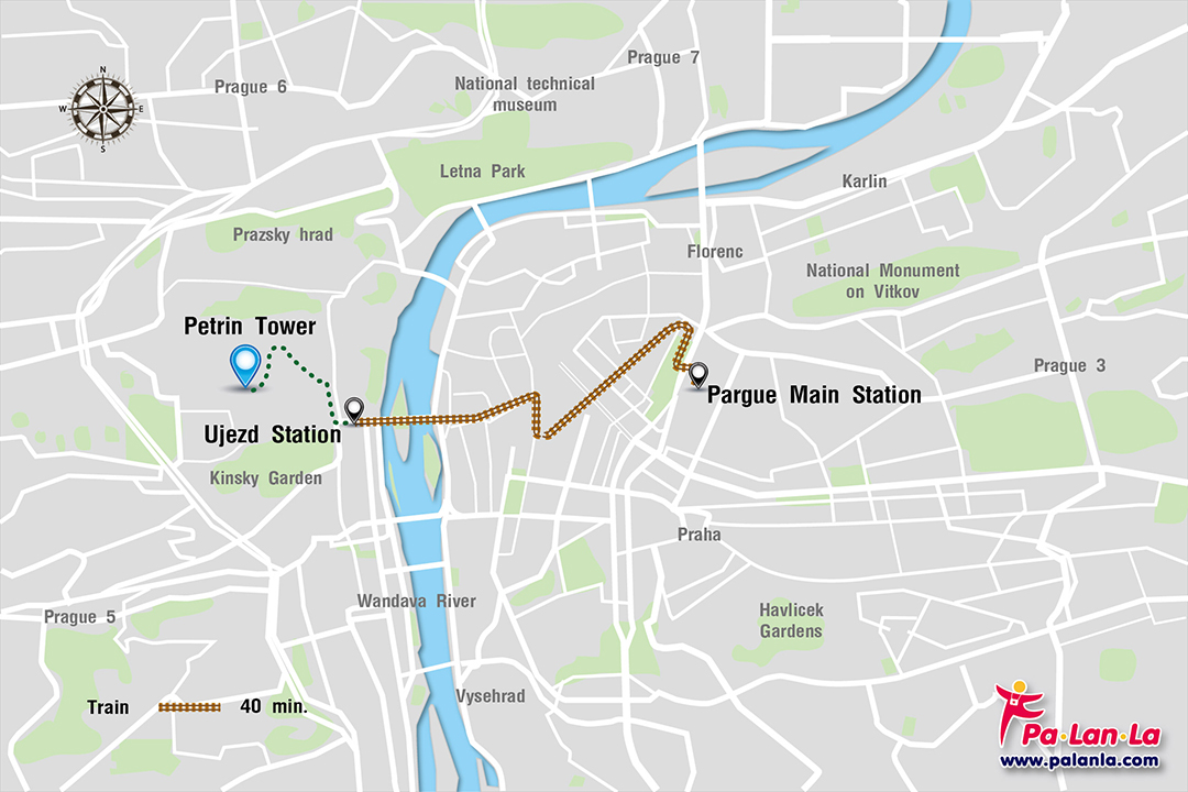 - รถไฟ จาก Prague Main Station ให้ขึ้นรถไฟหมายเลข 9 เพื่อไปลงที่สถานี Ujezd Station ระยะทางประมาณ 7 กิโลเมตร ใช้เวลาเดินทางประมาณ 40 นาที แล้วเดินต่อไปอีกประมาณ 15 นาที ก็จะถึง เพ็ตทรีน ทาวเวอร์