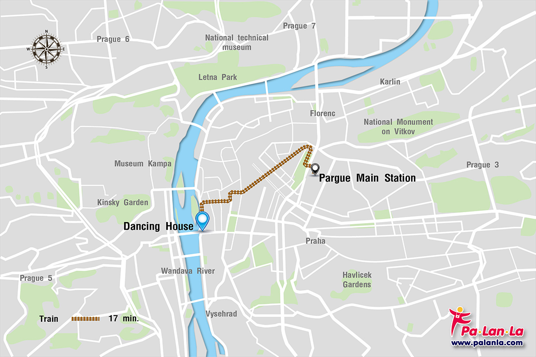- รถไฟ จาก Prague Main Station ให้ขึ้นรถไฟหมายเลข 5 เพื่อไปลงที่สถานี Jiraskovo Namesti Station ระยะทางประมาณ 4 กิโลเมตร ใช้เวลาเดินทางประมาณ 17 นาที ตัวสถานีจะอยู่บริเวณ อาคารเต้นรำ พอดี