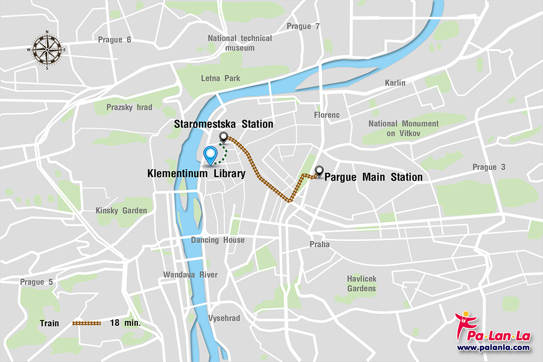 - รถไฟ จาก Prague Main Station ให้ขึ้นรถไฟ ที่สถานี Muzeum Station เพื่อไปลงที่สถานี Staromestska Station ระยะทางประมาณ 4 กิโลเมตร ใช้เวลาเดินทางประมาณ 18 นาที แล้วเดินต่อไปอีกเล็กน้อยก็จะถึง หอสมุดเคลเมนตินัม