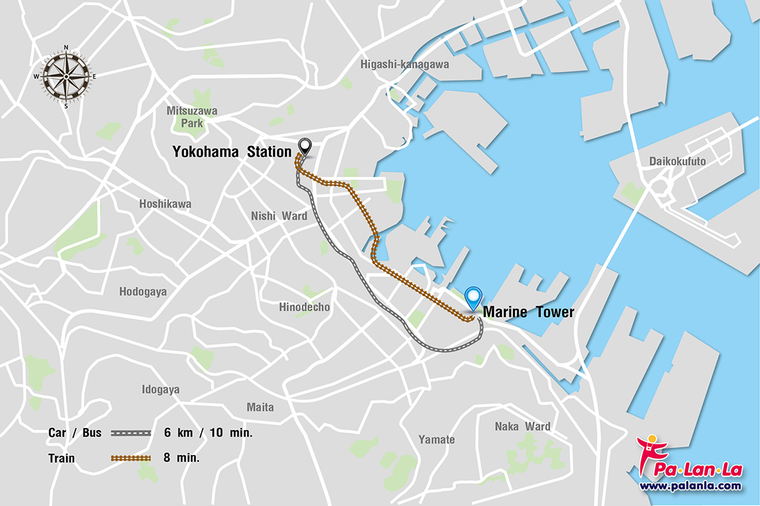 - รถยนต์ จาก Yokohama Station ไปยัง ประภาคารมารีน ทาวเวอร์ ระยะทางประมาณ 6 กิโลเมตร ใช้เวลาเดินทางประมาณ 10 นาที