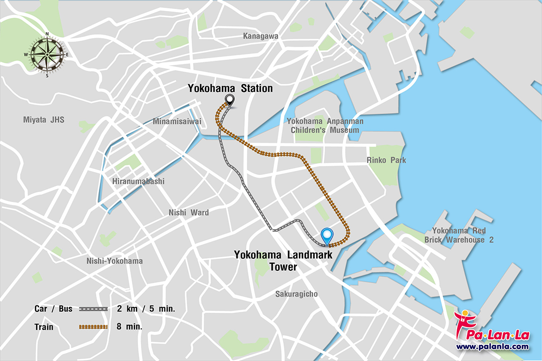 - รถยนต์ จาก Yokohama Station ไปโยโกฮาม่า แลนด์มาร์ก ทาวเวอร์ ระยะทางประมาณ 2 กิโลเมตร ใช้เวลาเดินทางประมาณ 5 นาที