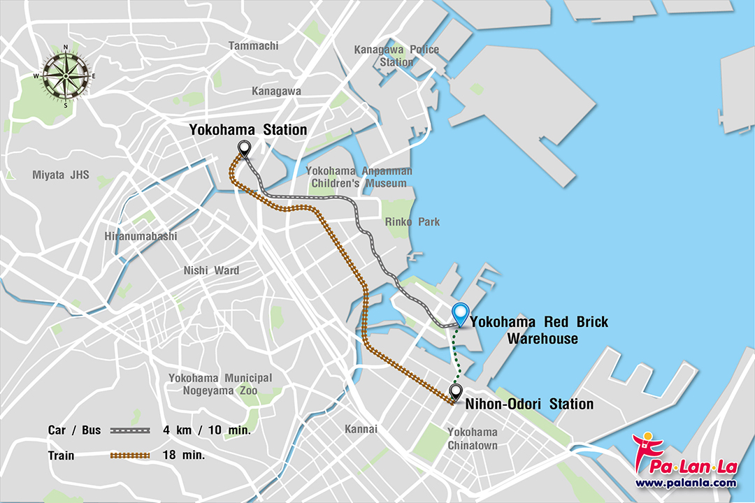- รถยนต์ จาก Yokohama Station ไปยัง อาคารอิฐแดง ระยะทางประมาณ 4 กิโลเมตร ใช้เวลาเดินทางประมาณ 10 นาที
