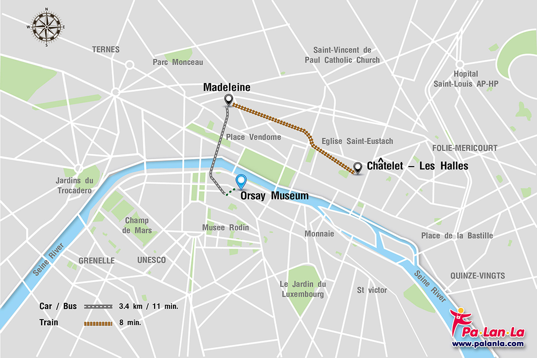 - รถยนต์ จากสถานี Châtelet - Les Halles ไปยัง Orsay Museum โดยใช้ถนนเส้น Rue de Rivoli มีระยะทาง 3.4 กิโลเมตร ใช้เวลาเดินทางประมาณ 11 นาที