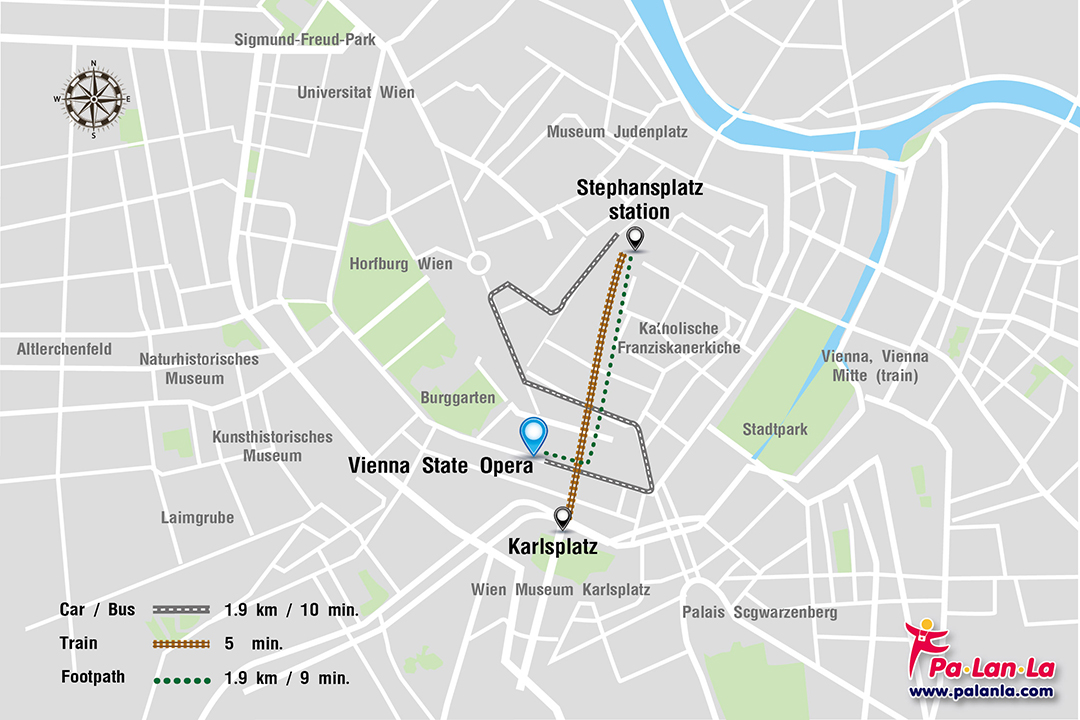 - รถยนต์ (Car) การเดินทางโดยรถยนต์จาก Stephansplatz Station ไปยัง Vienna State Opera โดยผ่าน Karntner Ring มีระยะทาง 1.9 กิโลเมตร ใช้เวลาเดินทางประมาณ 10 นาที