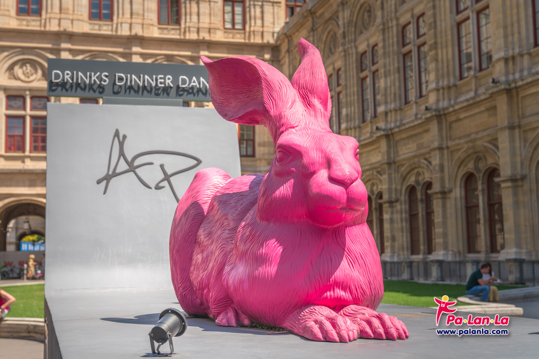 รูปปั้น กระต่ายยักษ์สีชมพูโดย Ottmar Horl บริเวณด้านนอกอาคารที่นักท่องเที่ยวนิยมมาถ่ายรูป
