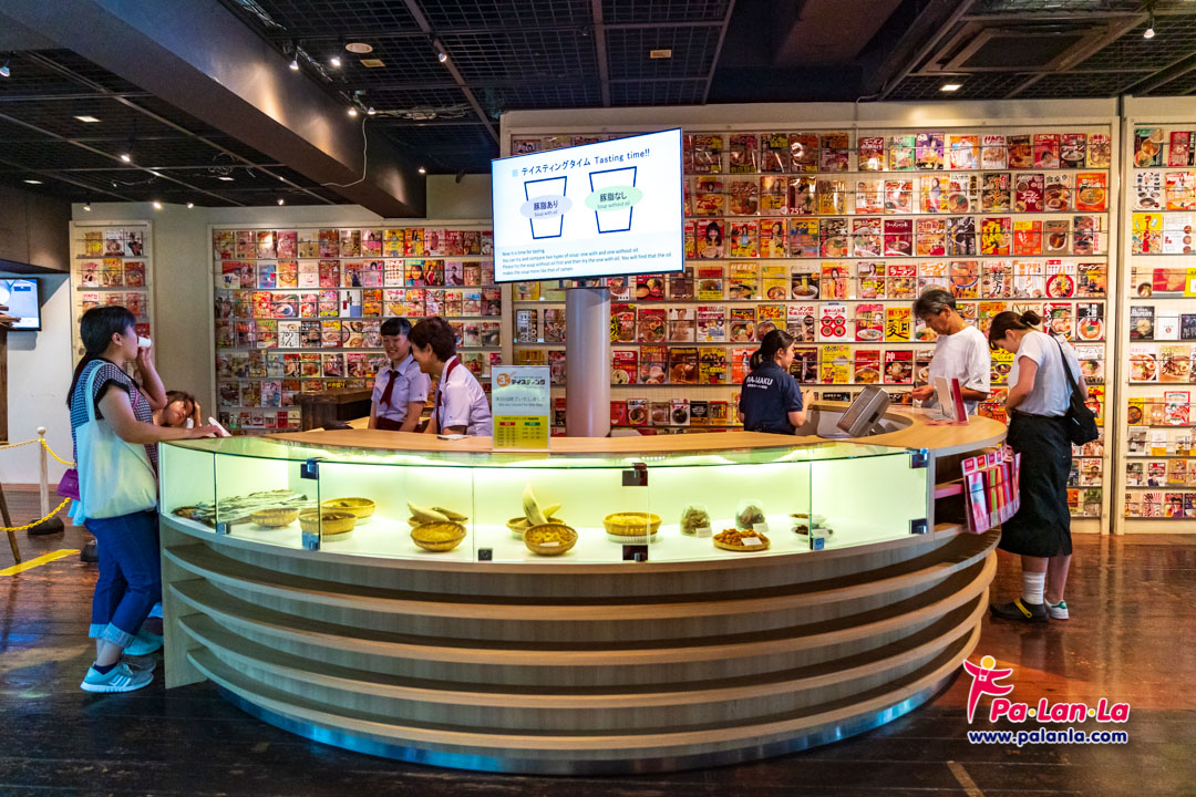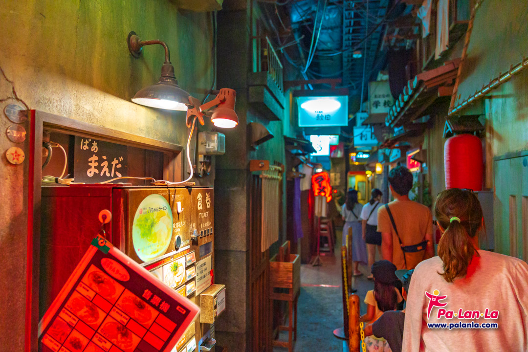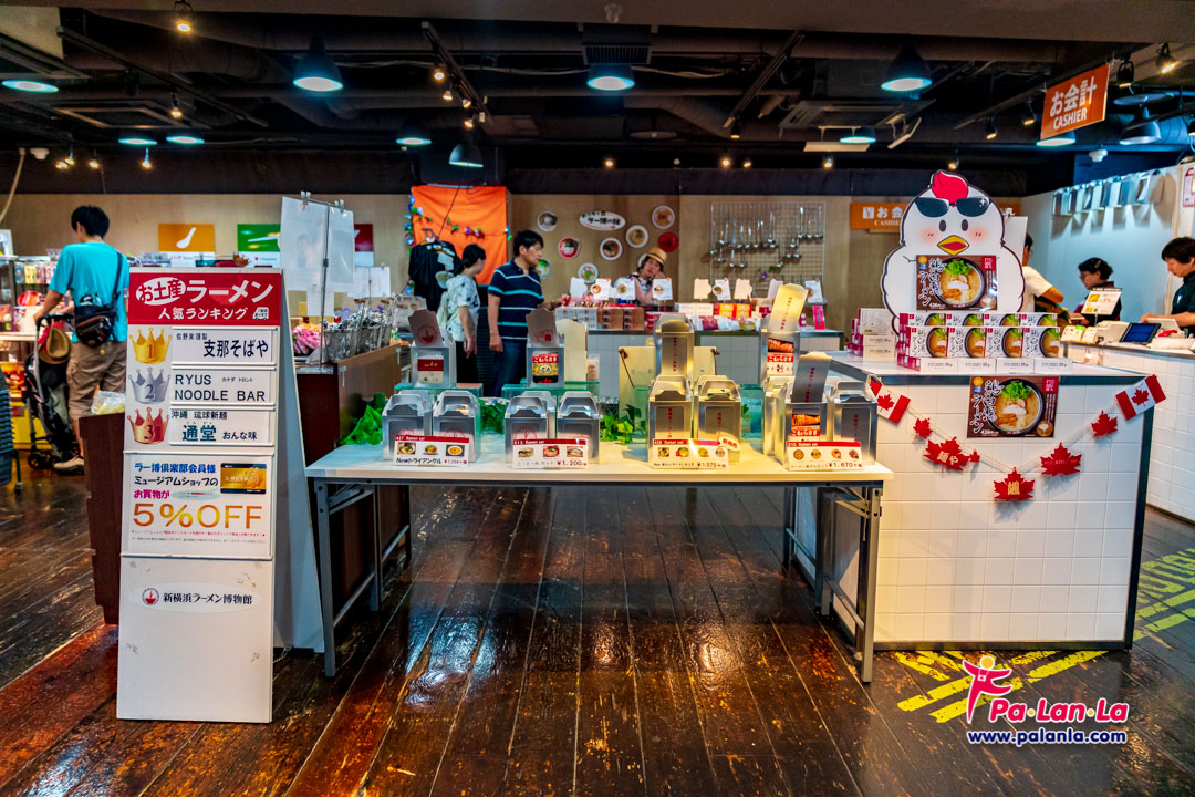 ต่อมาก็ถึงเสน่ห์หลักที่ทำให้พิพิธภัณฑ์แห่งนี้เป็นหนึ่งในสถานที่ที่มีนักท่องเที่ยวหนาแน่นตลอดเวลา คือย่านราเมงที่กินพื้นที่ชั้นใต้ดินทั้งสองชั้น (B1/B2) ของตัวพิพิธภัณฑ์ โดยจะเป็นโซนที่สถาปัตยกรรมทุกอย่างภายในไม่ว่าจะเป็นร้านค้า ดวงไฟ พื้นทางเดิน โต๊ะ เก้าอี้ ฯลฯ ถูกดีไซน์ให้อยู่ในบรรยากาศของเมืองชิตามาชิ (Shitamachi City) ช่วงปีค.ศ. 1958 ซึ่งเป็นยุคที่เป็นจุดกำเนิดของอาหารรสชาติกลมกล่อมอย่างราเมง โดยในตอนนั้นราเมงถือเป็นอาหารที่คนญี่ปุ่นกินกันเป็นจากหลักในแต่ละวัน และแน่นอนว่าที่ขาดไม่ได้คือร้านราเมงประจำย่าน ซึ่งทางพิพิธภัณฑ์ก็ไม่ทำให้ผิดหวังเพราะมีการนำร้านราเมงชื่อดังจากทั่วทุกสารทิศของประเทศ มาเปิดร้านขายกันภายในย่านตลอดทั้งปี พร้อมหมุดเวียนเปลี่ยนร้านไปเรื่อยๆ ขึ้นอยู่กับกระแส และความน่าสนใจของร้านราเมงที่ทางทีมงานของพิพิธภัณฑ์คัดสรรกันมา ทำให้ผลพลอยได้ไปตกอยู่ที่นักท่องเที่ยวที่มาเยี่ยมชม เพราะจะได้ลองกินราเมงอร่อยๆ จากร้านค้าที่มีรสชาติราเมงแตกต่างกันไปตามจุดขายของตัวเองท่ามกลางบรรยากาศเมืองเก่าของญี่ปุ่นที่เปี่ยมไปด้วยเสน่ห์ และกลิ่นหอมของน้ำซุปราเมงที่โชยมาจากร้านต่างๆ ภายในย่านนั่นเอง