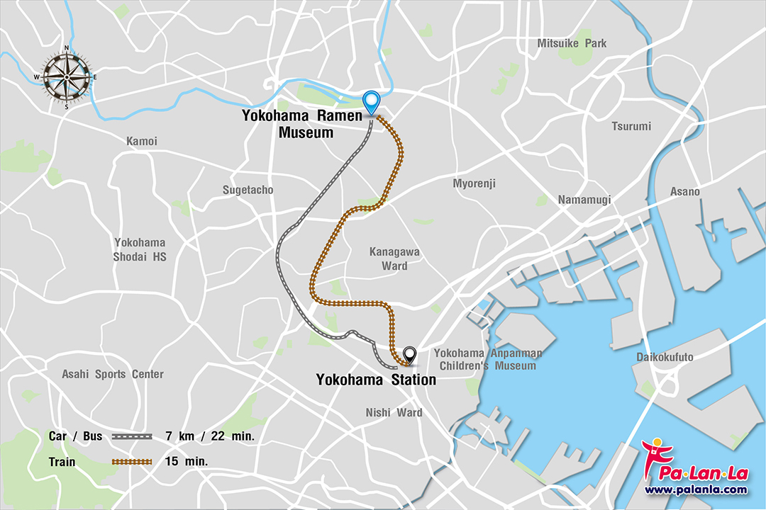 - รถยนต์ จาก Yokohama Station ไปยัง พิพิธภัณฑ์ราเมง ระยะทางประมาณ 7 กิโมเมตร ใช้เวลาเดินทางประมาณ 22 นาที