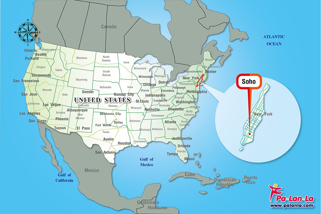 แผนที่ตั้ง ย่านโซโห เมืองนิวยอร์ก ประเทศสหรัฐอเมริกา