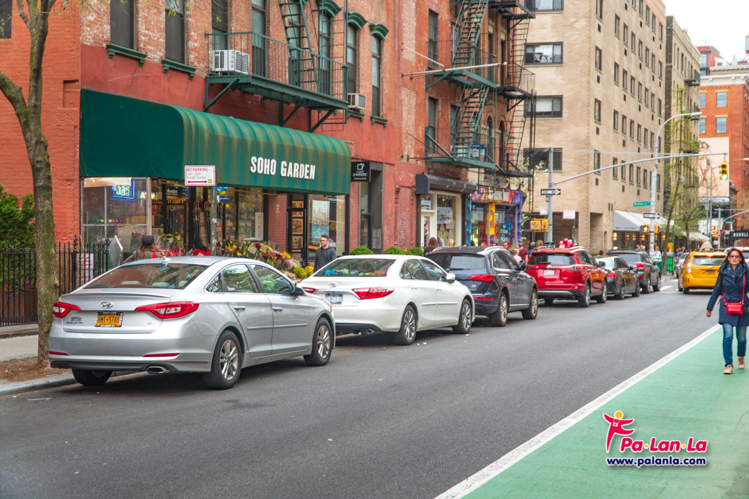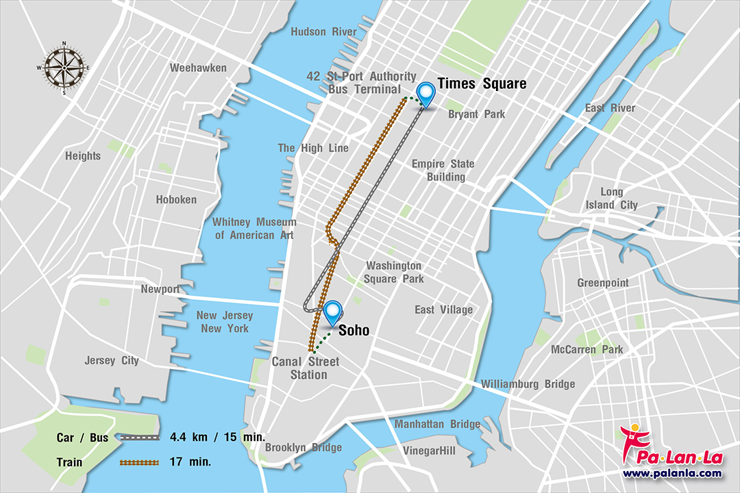 - รถยนต์ (Car) จาก Times Square ไปยัง Soho ระยะทางประมาณ 4.4 กิโลเมตร ใช้เวลาประมาณ 15 นาที ทั้งนี้ขึ้นอยู่กับสภาพการจราจร