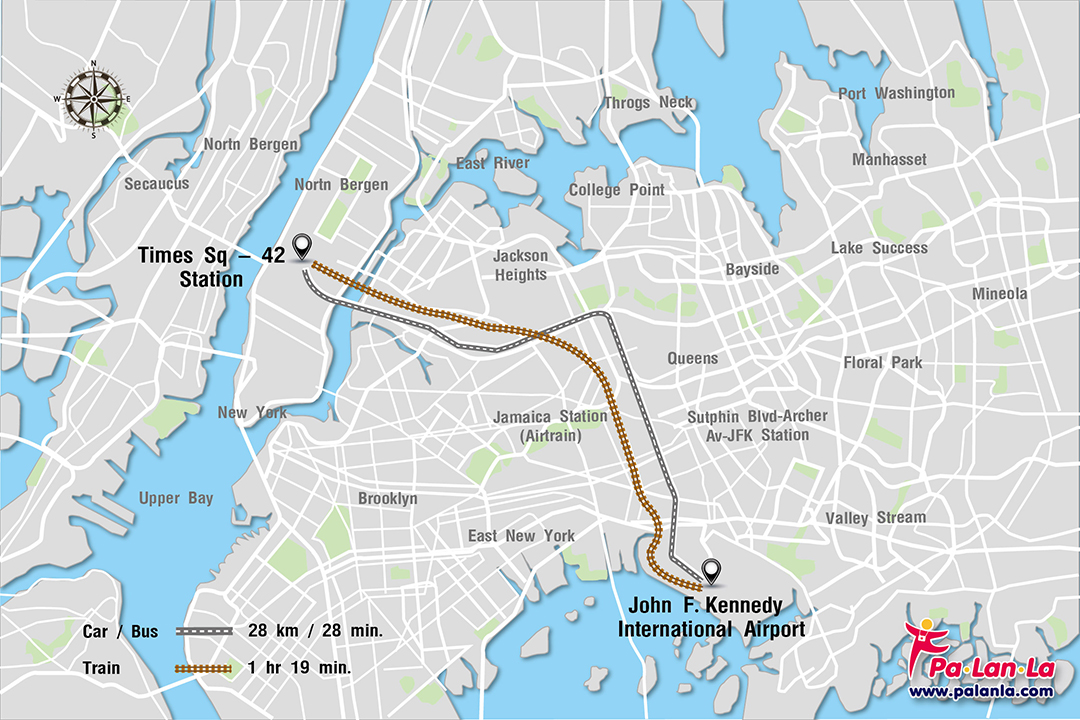 - รถยนต์ (Car) จากสนามบิน John F. Kenedy International ไปยังสถานี Time Sq – 42 St ระยะทางประมาณ 28 กิโลเมตร ใช้เวลาประมาณ 28 นาที