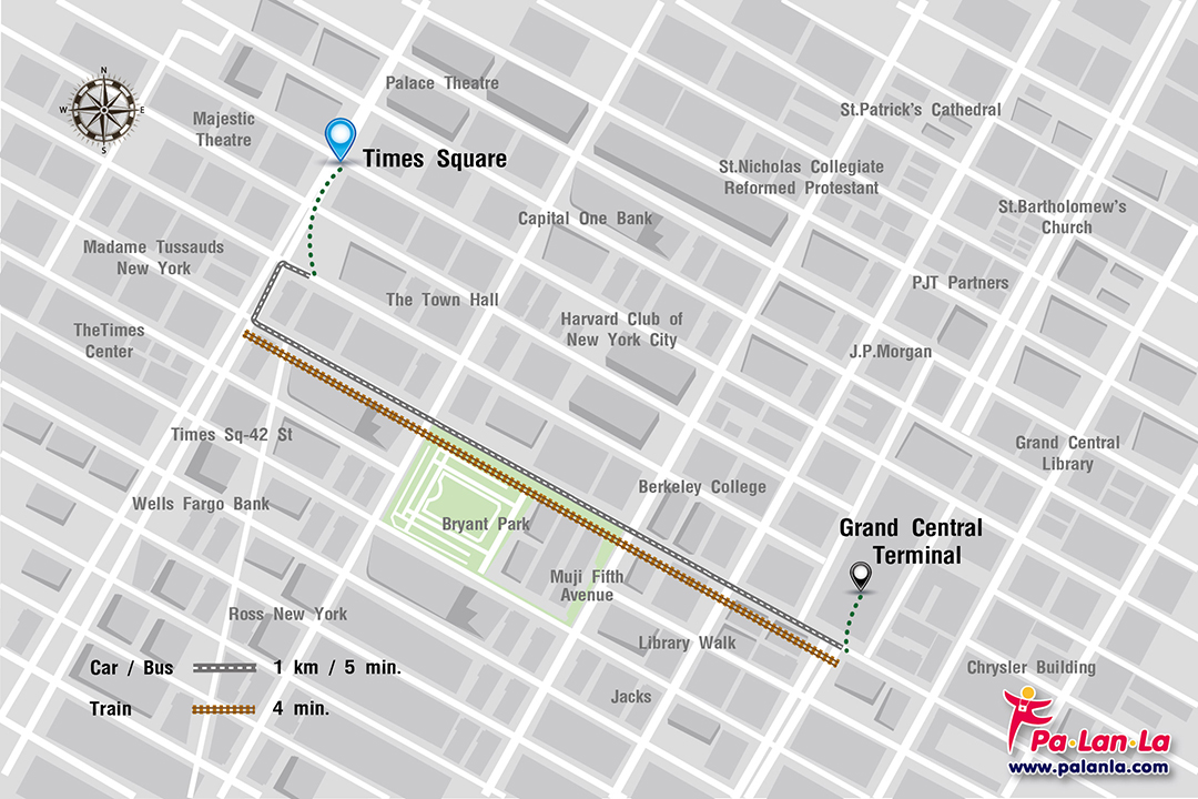 - รถไฟ (Train) นักท่องเที่ยวสามารถนั่งรถไฟใต้ดินจากสถานี Times Sq – 42 St ไปลงที่สถานี Grand Central – 42 St จากนั้นเดินต่ออีกประมาณ 2 นาที ใช้เวลาประมาณ 4 นาที