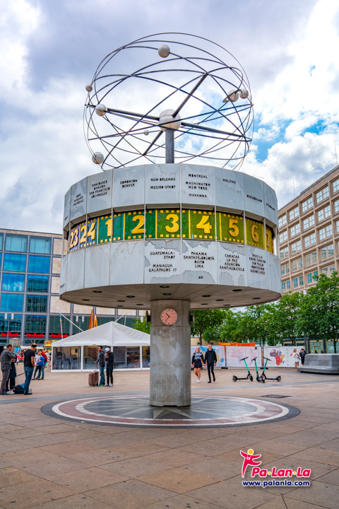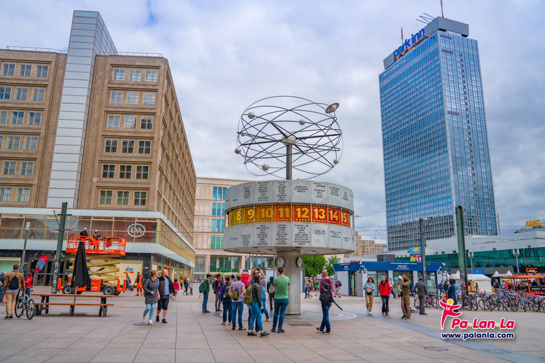 นาฬิกาโลก (World Time Clock) ตั้งอยู่กลางจัตุรัส บริเวณด้านซ้ายของภาพคือโรงแรม Park Inn และด้านขวาของภาพคือห้าง Saturn ห้างขายอุปกรณ์อิเล็กทรอนิกส์