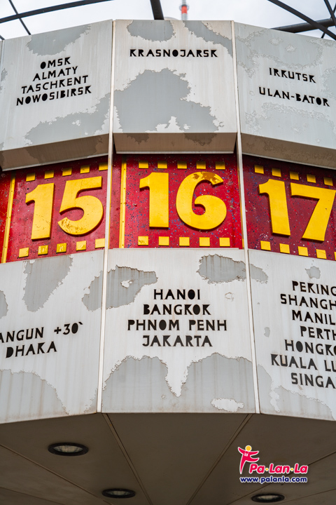 นาฬิกาโลก (World Time Clock) ด้านบนออกแบบให้เหมือนระบบสุริยจักรวาล(รูปซ้าย) เวลาในเขตเอเชียตะวันออกเฉียงใต้ เช่น ฮานอย กรุงเทพฯ พนมเปญ และจาการ์ตา(รูปขวา)