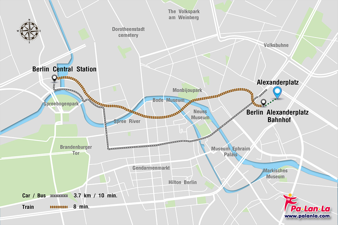 - รถไฟ (Train) จาก Berlin Central Station ขึ้นรถไฟสาย S ไปลงสถานี Berlin Alexanderplatz Bahnhof และเดินต่อไปยัง Alexanderplatz อีกประมาณ 180 เมตร ใช้เวลาโดยรวมประมาณ 10 นาที