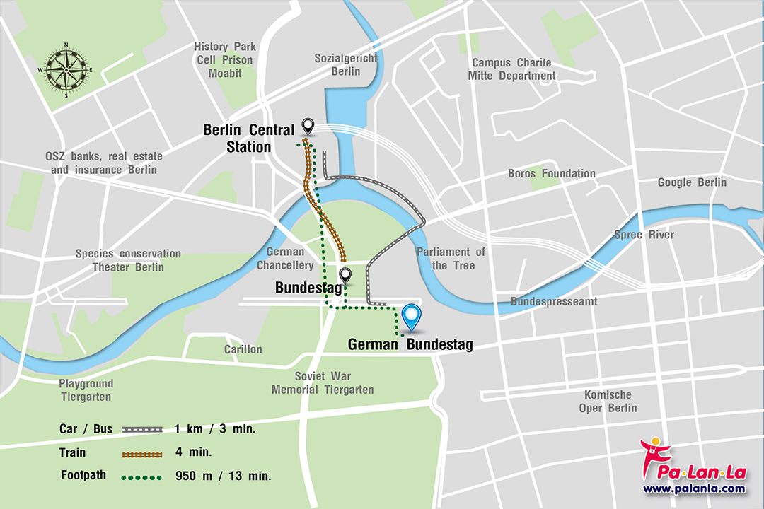 - เดิน (Footpath) จาก Berlin Central Station ไปยัง German Bundestag มีระยะทางประมาณ 950 เมตร ใช้เวลาเดินทางประมาณ 13 นาที