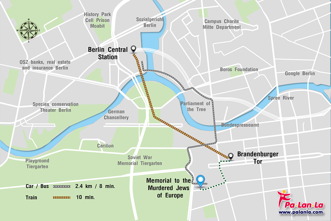 - รถไฟ (Train) จาก Berlin Central Station ขึ้นรถไฟสาย U ไปลงสถานี Brandenburger Tor และเดินต่อไปยัง Memorial to the Murdered Jews of Europe อีกประมาณ 600 เมตร ใช้เวลาโดยรวมประมาณ 10 นาที