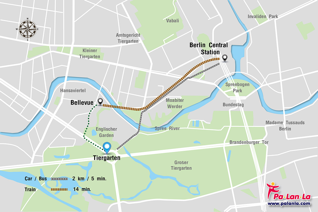 - รถไฟ (Train) จาก Berlin Central Station ขึ้นรถไฟสาย S ไปลงสถานี Bellevue และเดินต่อไปยัง Tiergarten ใช้เวลาโดยรวมประมาณ 14 นาที
