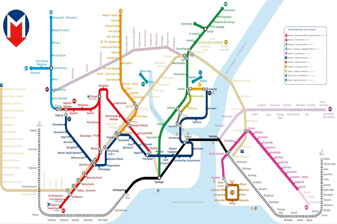 แผนที่ขนส่งสาธารณะในอิสตันบูล ซึ่งในขณะนี้ยังไม่มีเส้นทางเชื่อมต่อถึงสนามบิน Istanbul Airport จะแล้วเสร็จและเปิดใช้งานในปี 2020 ดังนั้น หากต้องการใช้บริการรถไฟไปยังสถานที่ต่างๆ นักท่องเที่ยวจึงต้องเดินทางออกจากสนามบินโดยวิธีต่างๆ ข้างต้นก่อนแล้วค่อยมาต่อรถไฟในตัวเมือง ขอบคุณภาพจาก https://www.tooistanbul.com/en/public-transportation-istanbul/