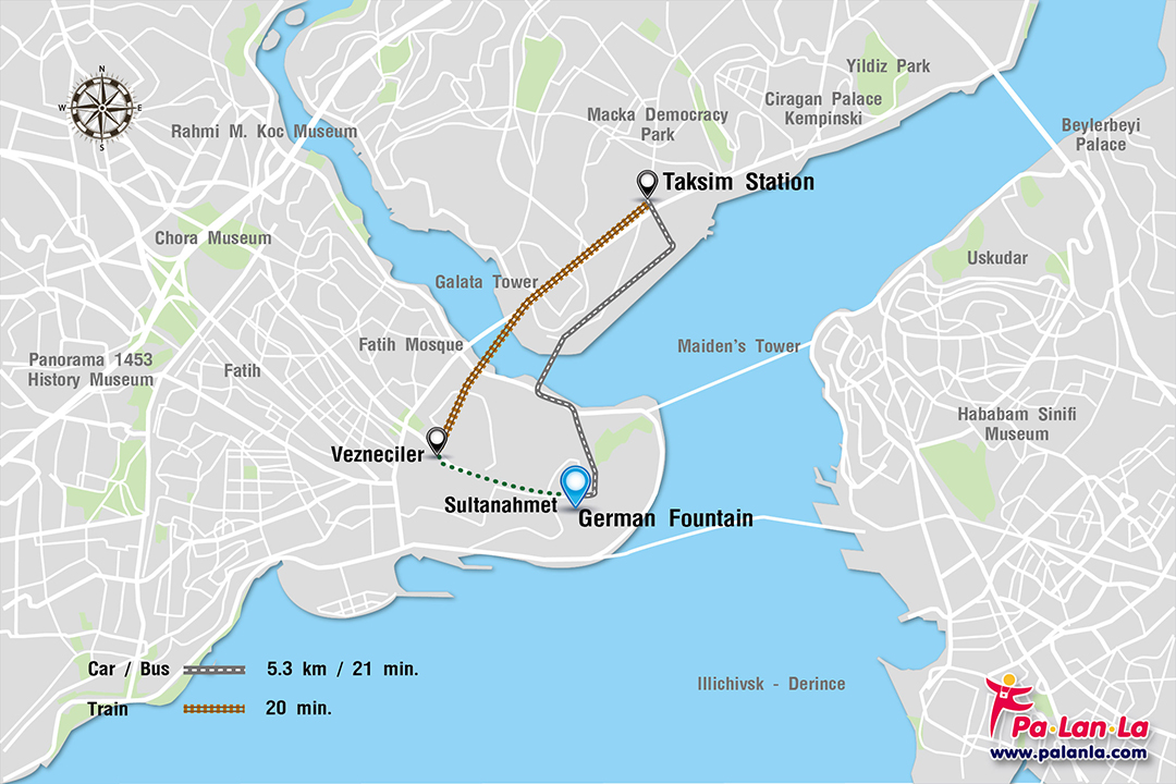 - รถยนต์ (Car) การเดินทางโดยรถยนต์จากสถานี Taksim ไปยัง German Fountain โดยใช้เส้น Meclis-i Mebusan Cd. มีระยะทาง 5.3 กิโลเมตร ใช้เวลาประมาณ 20 นาที