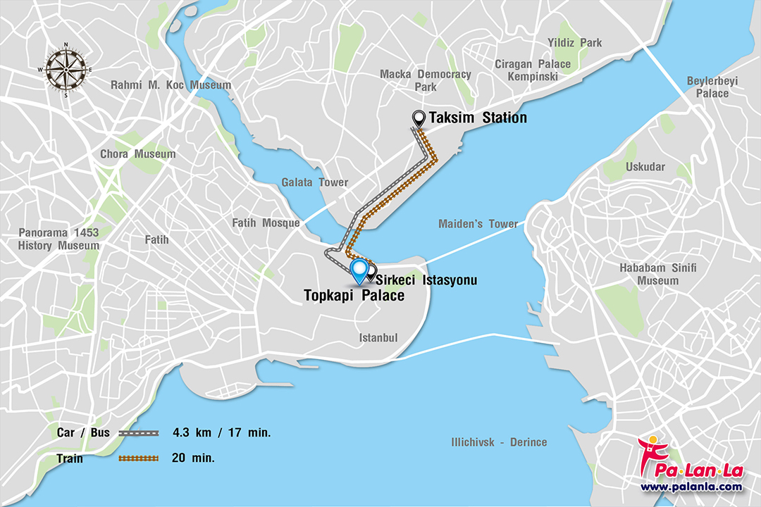 จากสถานี Taksim นักท่องเที่ยวสามารถเดินทางไปยัง Topkapi Palace ซึ่งตั้งอยู่ในเขตเมืองเก่าของอิสตันบูลได้ด้วยวิธีต่างๆ ดังนี้