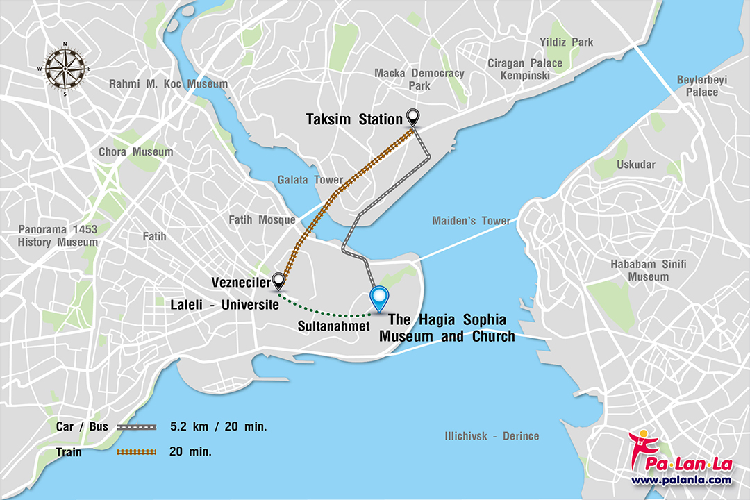 จากสถานี Taksim นักท่องเที่ยวสามารถเดินทางไปยัง The Hagia Sophia Museum and Church ได้ด้วยวิธีต่างๆ ดังนี้
