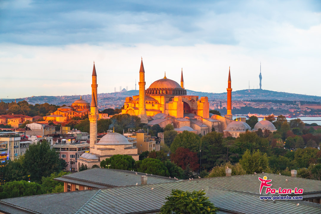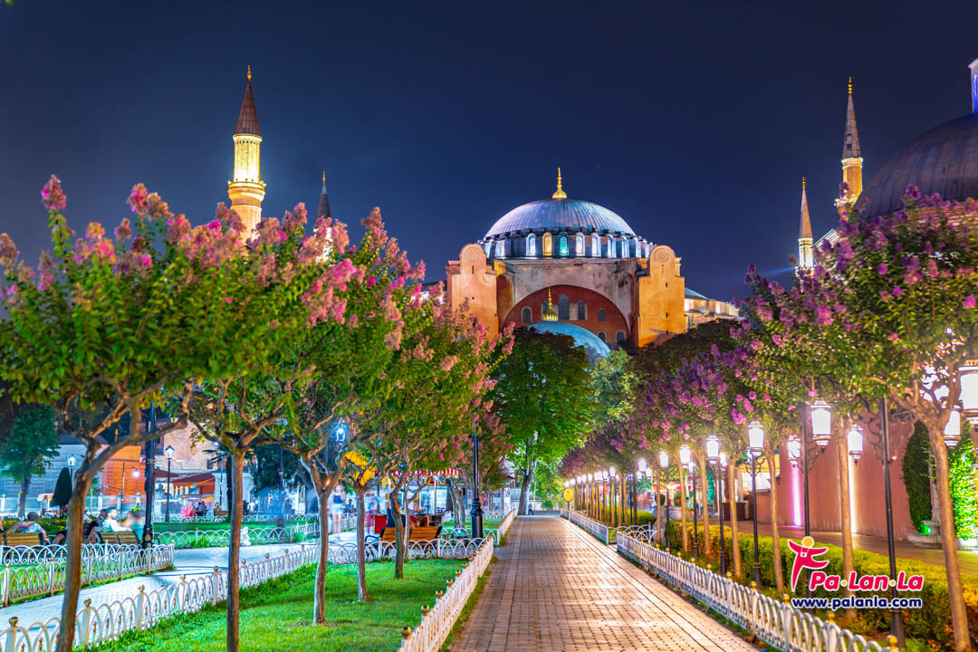 ฮาเกียโซเฟียในยามเย็นกับแสงไฟประดับที่ส่องสว่างสวยงาม