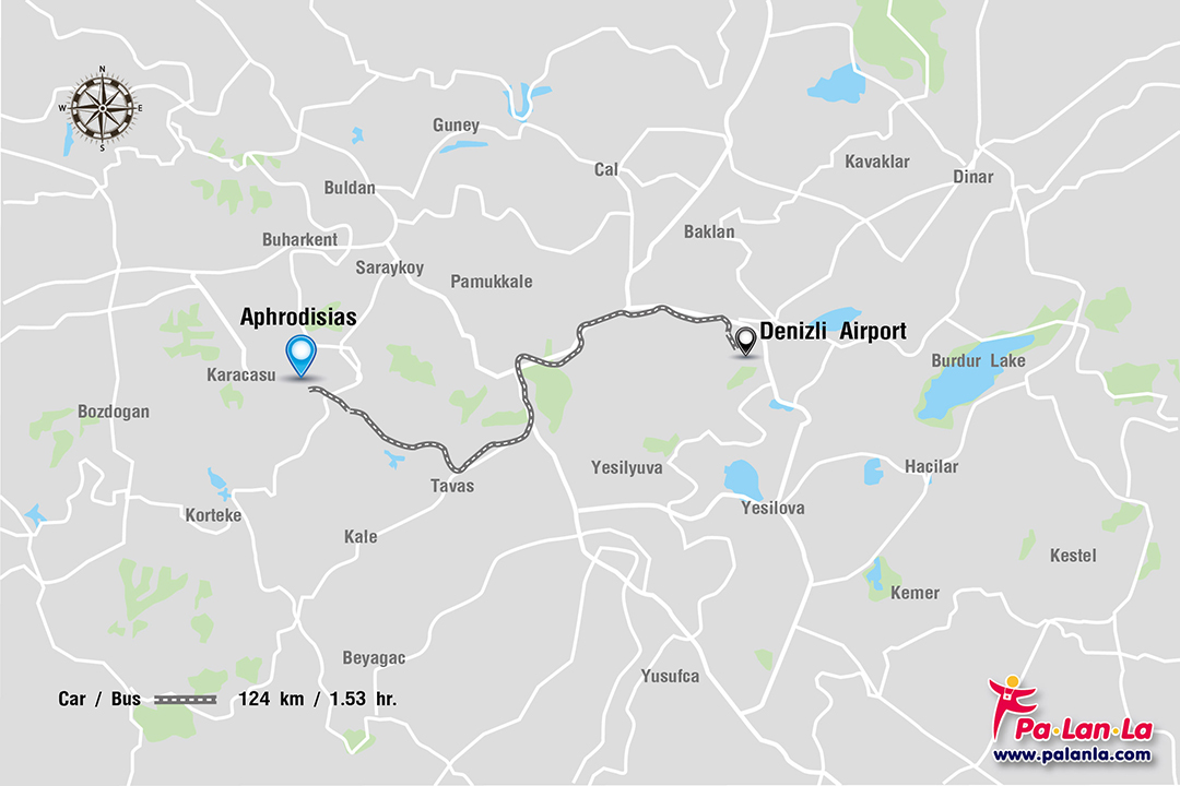 จากสนามบิน Denizli Airport ไป Aphrodisias มีระยะทาง 124 กิโลเมตร ใช้เวลาเดินทางโดยรถยนต์ประมาณ 1 ชั่วโมง 53 นาที