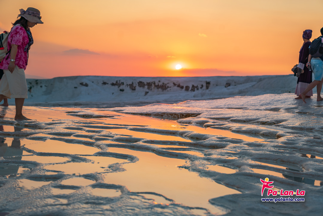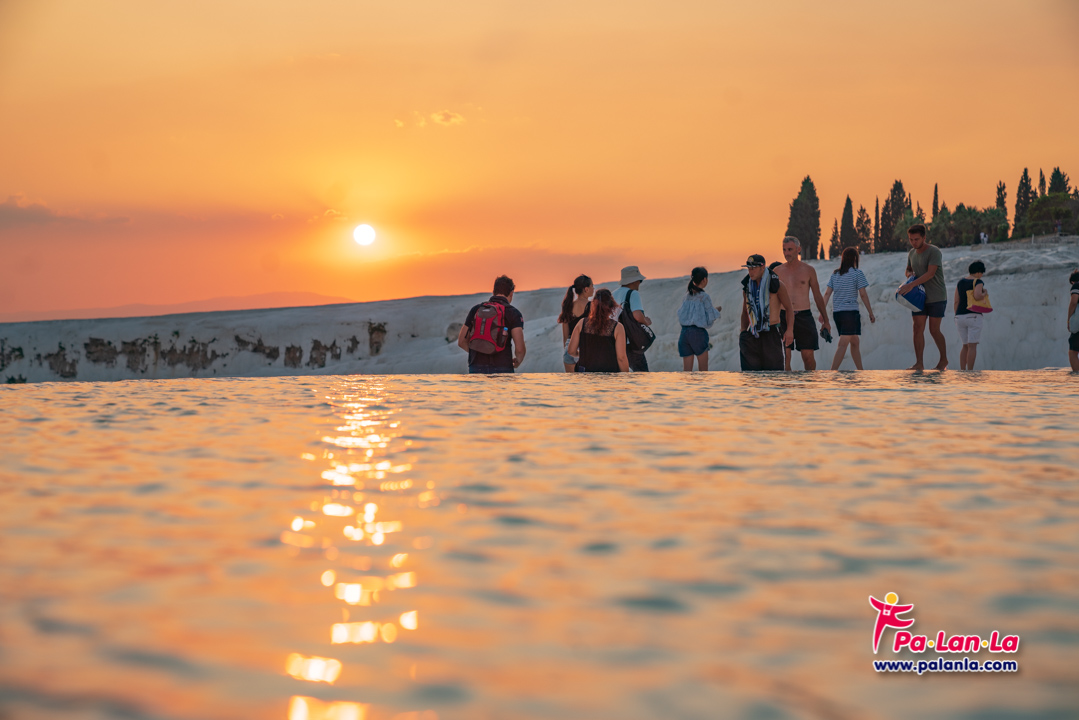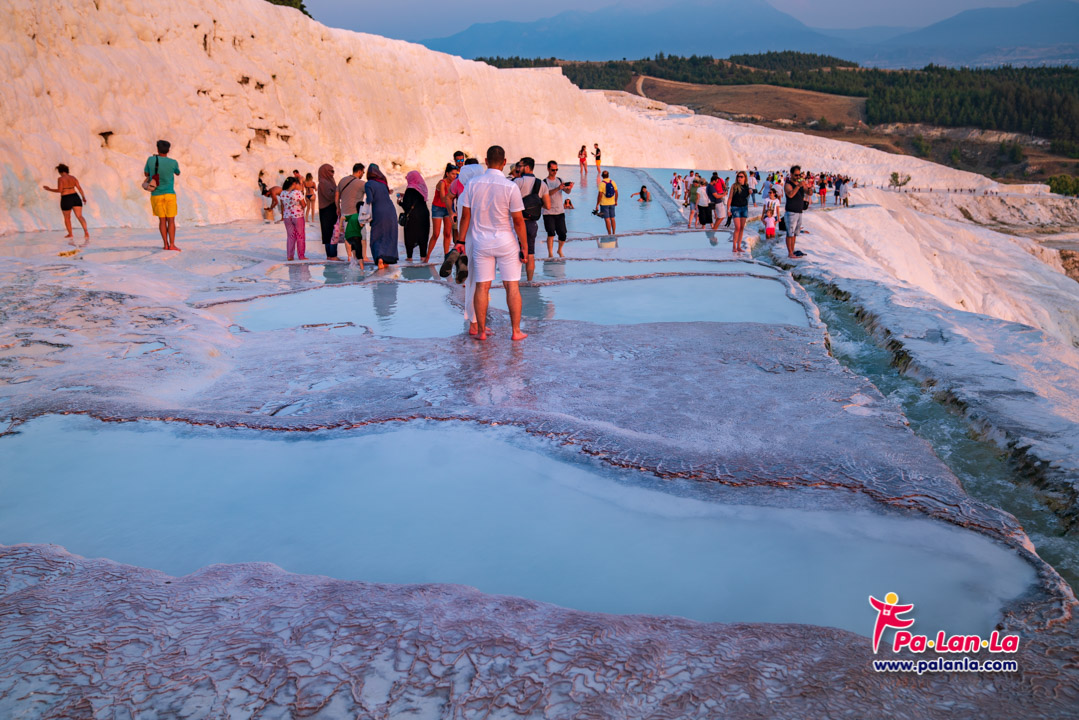 นักท่องเที่ยวดื่มด่ำกับบรรยากาศอันสวยงามของปามุคคาเล่ในยามเย็น