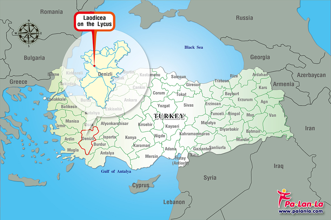 เมืองโบราณเลาดีเซีย (Laodicea on the Lycus / The ancient city of Laodicea) ตั้งอยู่ในจังหวัด Denizli เป็นเมืองโบราณในเขตชายแดนของตุรกี เมืองนี้เป็นแหล่งโบราณคดีที่คนส่วนใหญ่ไม่เคยมีใครรู้จักมาก่อน นักวิจัยคนแรกที่เริ่มสนใจซากปรักหักพังของเลาดีเซียคือ จี เวเบอร์ (G. Weber) โดยเขาได้เริ่มขุดค้นบางส่วนของเลาดีเซียในปี ค.ศ. 1833 และในปี ค.ศ. 1843 ต่อมาในปี ค.ศ. 2002 งานโบราณคดีระบบใหม่เริ่มขึ้น โดยทีมนักโบราณคดีศาสตราจารย์จากมหาวิทยาลัยปามุกคาเล่ (Pamukkale University) และพิพิธภัณฑ์เดนิซลี เมืองโบราณแห่งนี้จึงเป็นที่รู้จักมากขึ้น