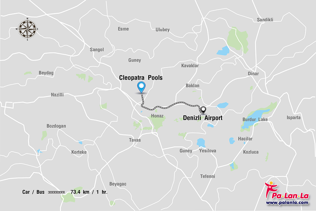 - รถยนต์ (Car) จากสนามบิน Denizli Airport ไป Cleopatra Pools มีระยะทาง 73.4 กิโลเมตร ใช้เวลาเดินทางโดยรถยนต์ประมาณ 1 ชั่วโมง