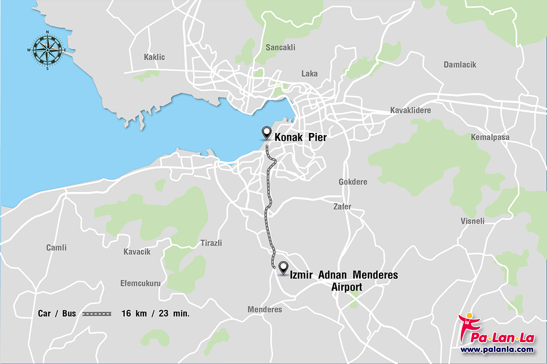 - รถยนต์ (Car) การเดินทางจากสนามบิน Izmir Adnan Menderes Airport ไป Konak Pier โดยใช้ถนนสาย D550 มีระยะทาง 16.5 กิโลเมตร ใช้เวลาเดินทาง 23 นาที
