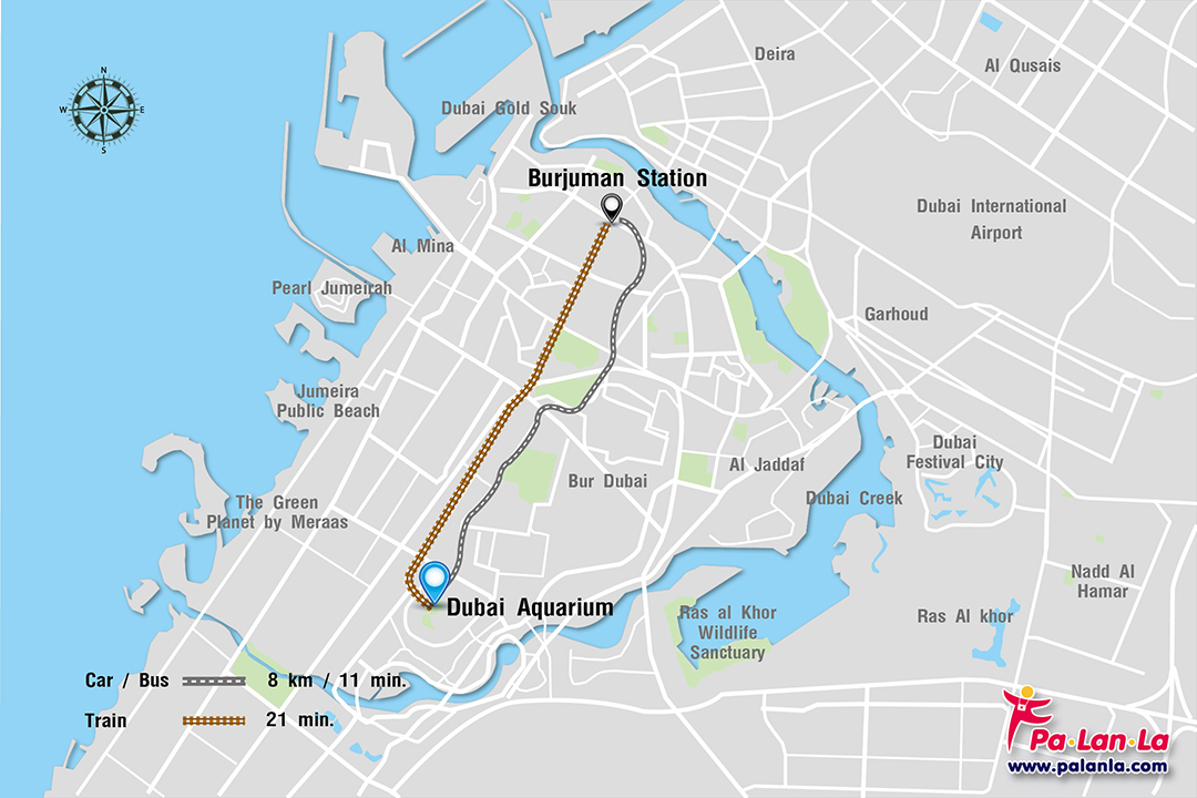 - รถยนต์ จาก Burjuman Station ไปยัง พิพิธภัณฑ์สัตว์น้ำดูไบ ระยะทางประมาณ 8 กิโลเมตร ใช้เวลาเดินทางประมาณ 11 นาที