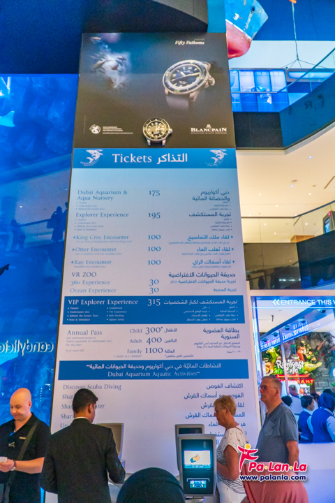 ป้ายแสดงราคาค่าเข้าชมในส่วนต่างๆ ของพิพิธภัณฑ์สัตว์น้ำดูไบ