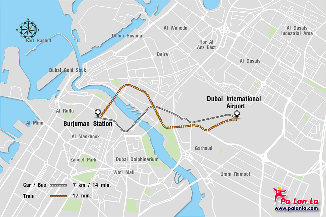 - รถยนต์ จากสนามบินไปยังสถานี Burjuman Station ระยะทางประมาณ 7 กิโลเมตร ใช้เวลาเดินทางประมาณ 14 นาที ตัวสถานีจะตั้งอยู่ใจกลางเมือง และเป็นชุมทางหลักในการเปลี่ยนไปขึ้นสายรถไฟเส้นอื่น