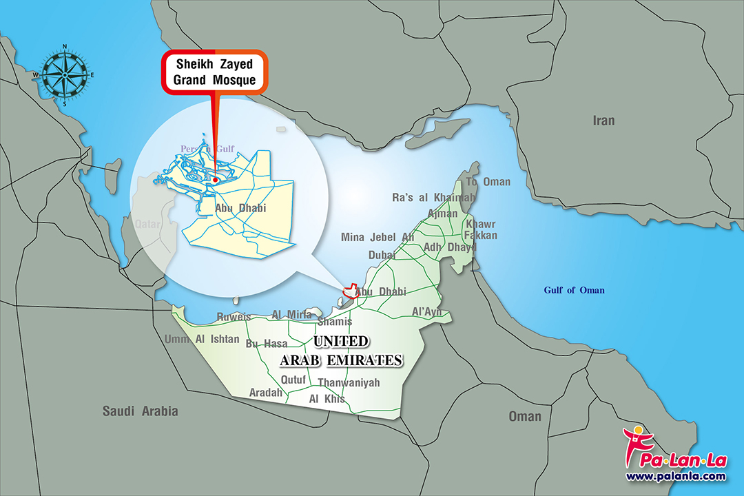 แผนที่ตั้ง มัสยิดหลวงเชคซัยยิด รัฐอาบูดาบี ประเทศอาหรับเอมิเรตส์