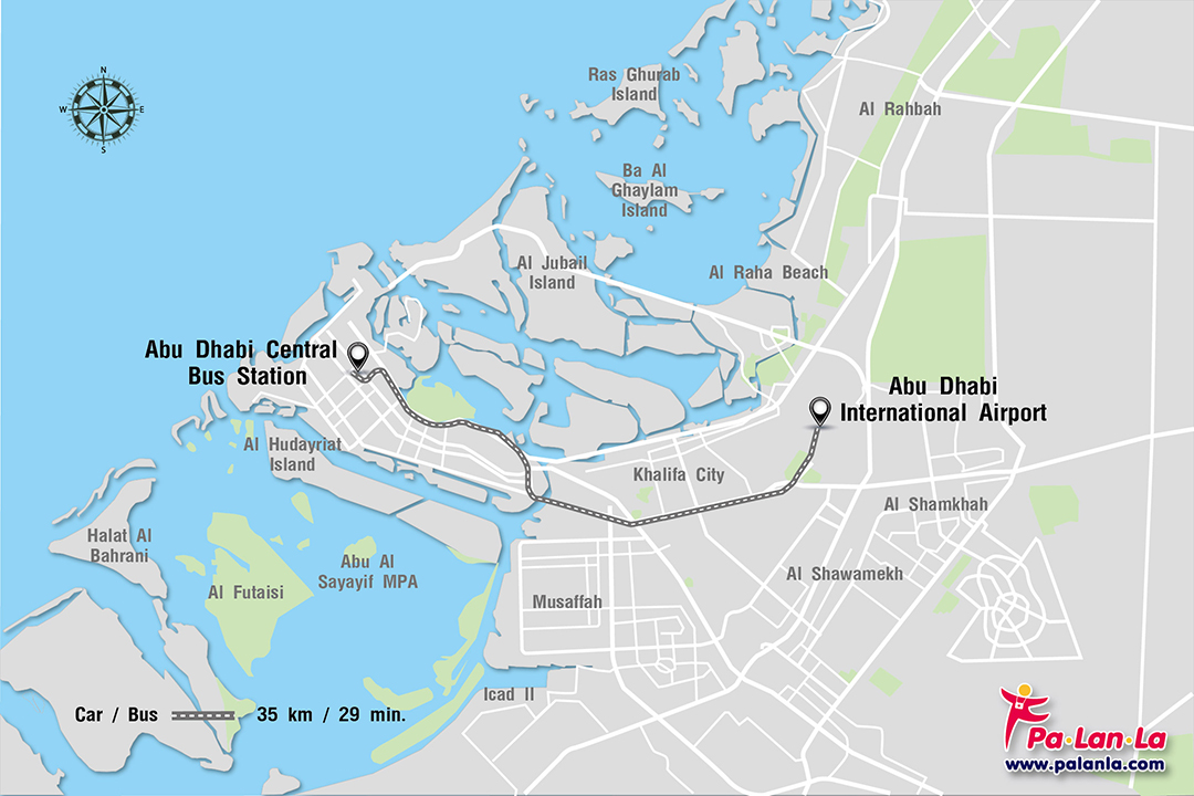 - รถประจำทาง จากสนามบินให้เดินมาขึ้นรถบัสสาย A1 หน้าเทอร์มินอล 1 เพื่อไปลงที่ Sultan Bin Zayed Station แล้วเปลี่ยนไปขึ้นรถบัสสาย 160, 163, 403, 404, 406 ไปลงที่ Abu Dhabi Central Bus Station ใช้เวลาเดินทางโดยรวมประมาณ 1 ชั่วโมง