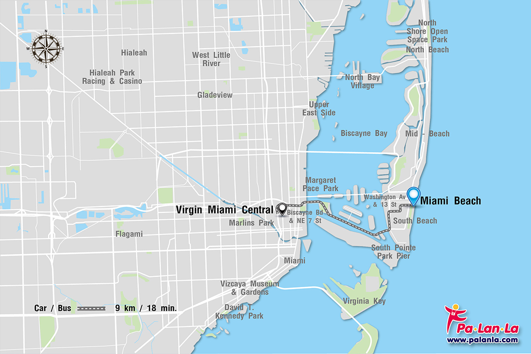 - รถยนต์ (Car) จากสถานีรถไฟ Virgin Miami Central ไปยัง Miami Beach ระยะทางประมาณ 9 กิโลเมตร ใช้เวลาเดินทางประมาณ 18 นาที ทั้งนี้ขึ้นอยู่กับสภาพการจราจร