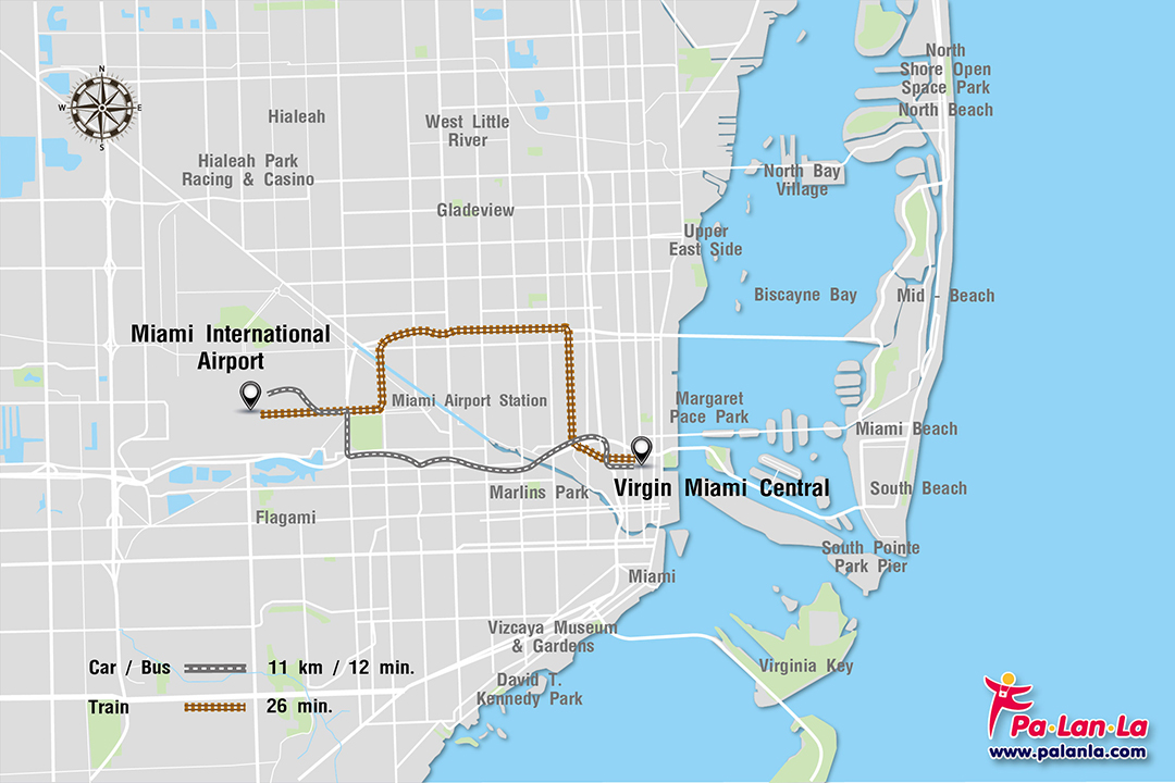 จากท่าอากาศยานนานาชาติ Miami International Airport (MIA) โดยมีจุดหมายปลายทางที่สถานีรถไฟ Virgin Miami Central