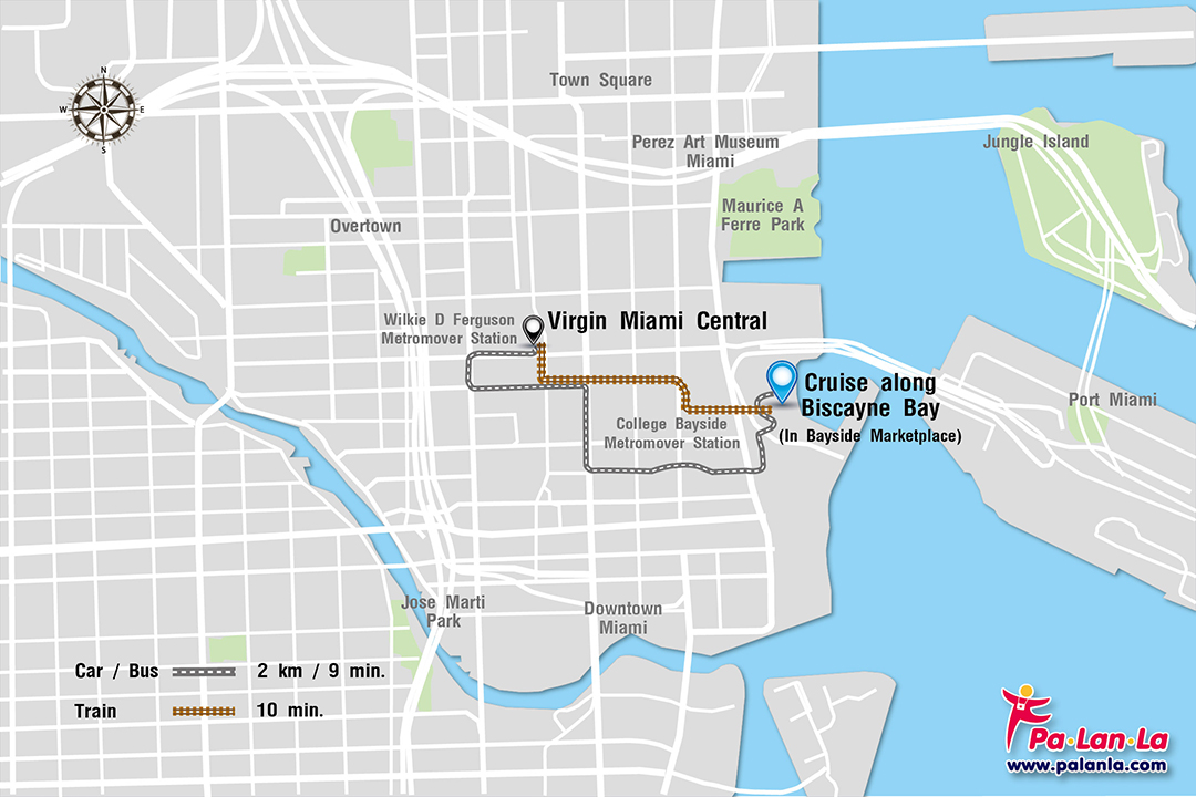 - รถยนต์ (Car) จากสถานีขนส่ง Virgin Miami Central ไปยังท่าเรือชมอ่าวบิสเคย์น ภายในศูนย์การค้า Bayside Marketplace ระยะทางประมาณ 2 กิโลเมตร ใช้เวลาเดินทางประมาณ 9 นาที ทั้งนี้ขึ้นอยู่กับสภาพการจราจร